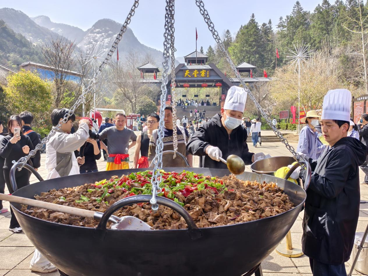 主题活动亮点纷呈,全时游玩体验升级。景区聚焦天堂寨饮食文化,在游客中心广场打造天堂寨特色美食体验场景。直径1.6米的天堂寨巨型吊锅堪称“吊锅巨无霸”,成为游客争相打卡的网红地标。烟火气息浓郁,成为游客心中难忘的春日记忆。