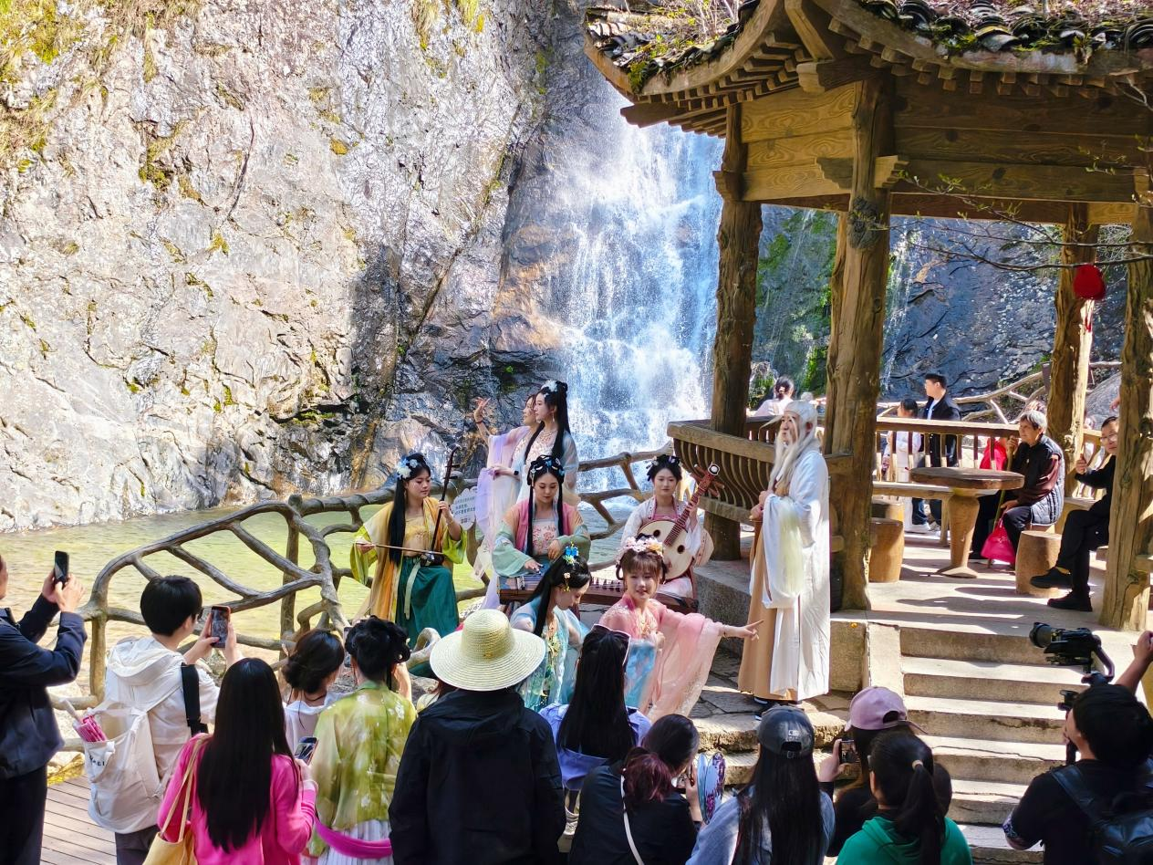 同步打造沉浸式国风文旅体验,“春山有声・瀑布为弦”国风音乐会在九影瀑旁奏响,古琴、竹笛与飞瀑流水声婉转和鸣;春山主题巡游、文创好礼互动等活动轮番上演;特邀外国留学生担任“春山体验官”,向海内外传播景区风光。精心规划七大春季精品旅游线路,覆盖踏青、研学、康养等多元出游需求,进一步丰富产品供给,不断提升春日旅游吸引力与竞争力。