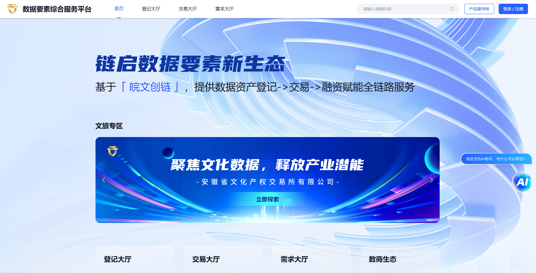 数据要素综合服务平台,作为安徽文交所数据要素发展规划的重要战略布局,由安徽文交所精心打造,以皖文创链为底层技术支撑,构建 数据要素市场核心枢纽,着力打造文化数据乃至全数据领域的业务底座,助力数据要素市场繁荣发展。