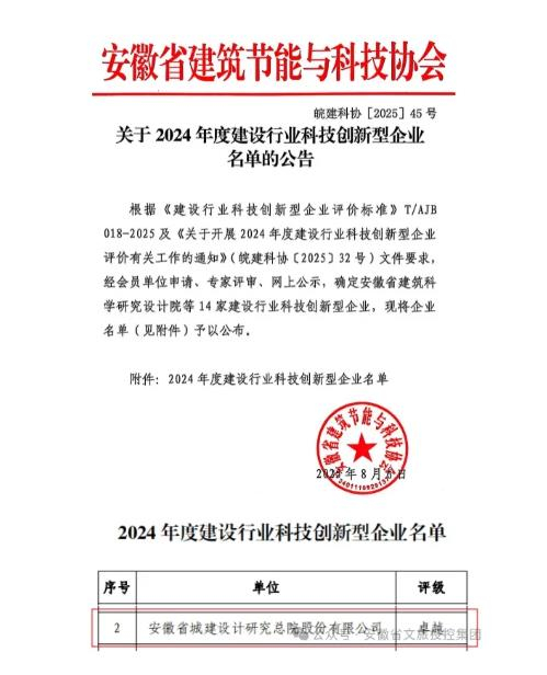 近日,安徽省建筑节能与科技协会公布2024年度建设行业科技创新型企业名单,安徽省城建设计研究总院股份有限公司获评“2024年度建设行业科技创新型企业”称号。