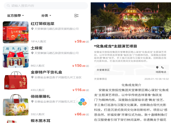优化产品矩阵,整合全域“红绿蓝”资源。官方平台打破传统“门票为主”的局限,进一步整合区域资源,完善“吃住行游购娱”全链条产品体系。集中展示门票限时优惠及区域内“酒+景”“酒+餐”基础套餐,支持一键预订与线下核销;同步上架多款地域文创产品与农副产品,游客可线上下单选择现场取货或邮寄到家,便捷带走大别山风情;引入天堂寨代表性的“化鱼成龙”主题演艺项目预约功能,方便游客提前规划行程。目前平台正持续丰富产品供给,上线红色研学、生态养殖等特色项目,设计“门票+科技体验”“门票+户外研学”套餐,进一步丰富二次消费场景。