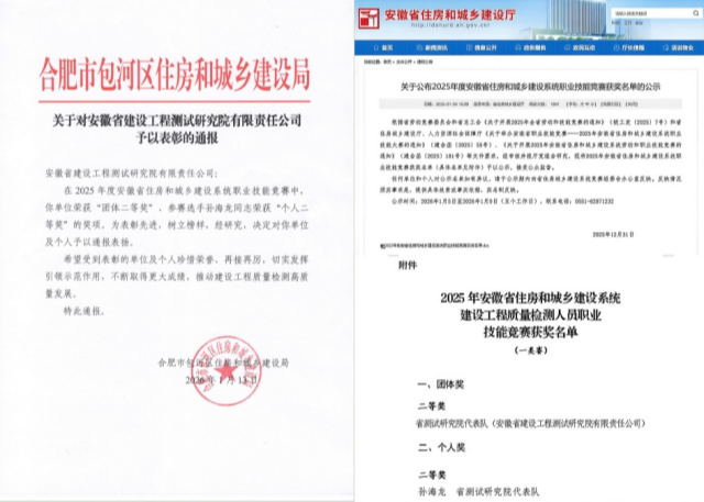 近日,2025年度安徽省住房和城乡建设系统职业技能竞赛圆满落幕,省城建总院院属测试公司凭借扎实的专业功底、精湛的技术水平和出色的团队协作能力,在比赛中脱颖而出,荣获大赛“团体二等奖”,工程检测六院孙海龙荣获“个人二等奖”,并受到合肥市包河区住房和城乡建设局通报表扬。