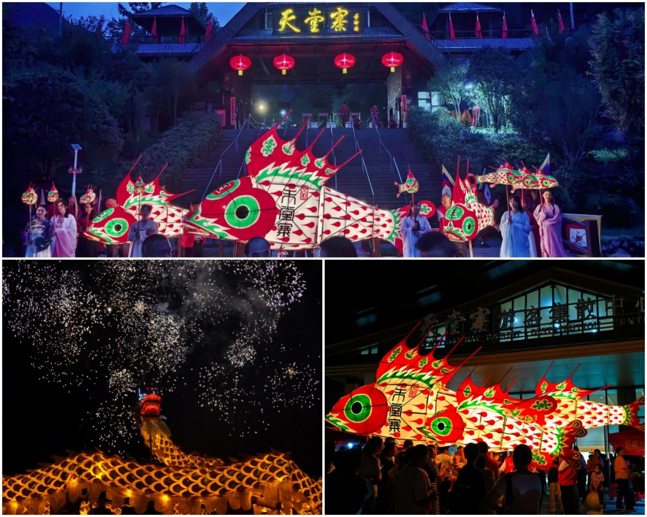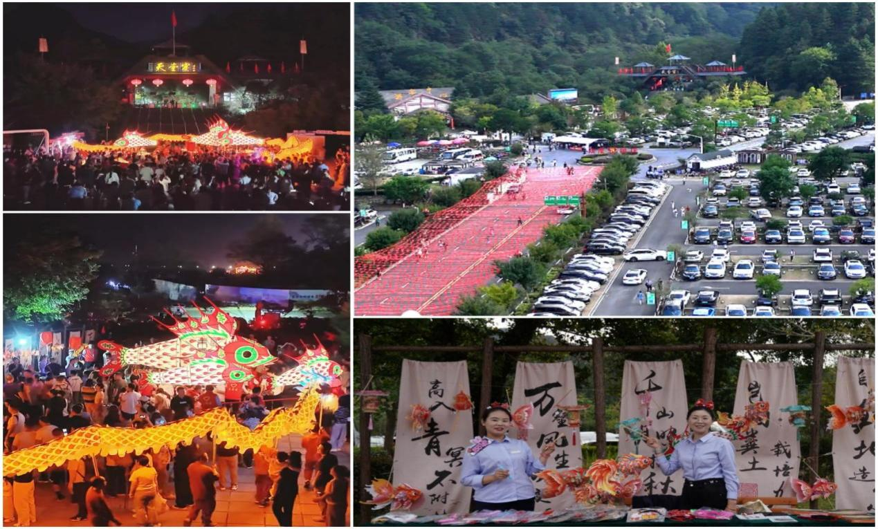 景区以“化鱼成龙”非遗文化为核心,打造“昼夜联动”活动矩阵,日间推出龙腾盛世·喜迎国庆、杂技巡演、古韵投壶互动、秋日西瓜大战、文创集市、清凉文创酸梅汤、孔明灯会等10余项体验活动,免费发放国旗脸贴、鱼灯造型书签等文创礼品一万余份;夜间开展重头戏非遗舞龙鱼灯夜演,组建了天堂寨景区首个员工常态化夜演团队,将开寨祈福、烟花秀、独轮车、汉服表演等多重元素融入其中,打造景区大门至御龙湾商业圈2公里沉浸式夜游巡演动线,线下每日约3000名游客现场互动参与及观看,线上每日吸引超1.2万人次观看,抖音话题#化鱼成龙夜游天堂寨#超7万次播放,短视频累计播放量破600万次,打响了天堂寨景区沉浸式夜演场景品牌。通过活动引流,景区客流持续火爆,10月3日、4日单日接待突破3万人次,10月6日游客增幅获央视CCTV13新闻频道报道,夜演巡游活动获安徽卫视报道。