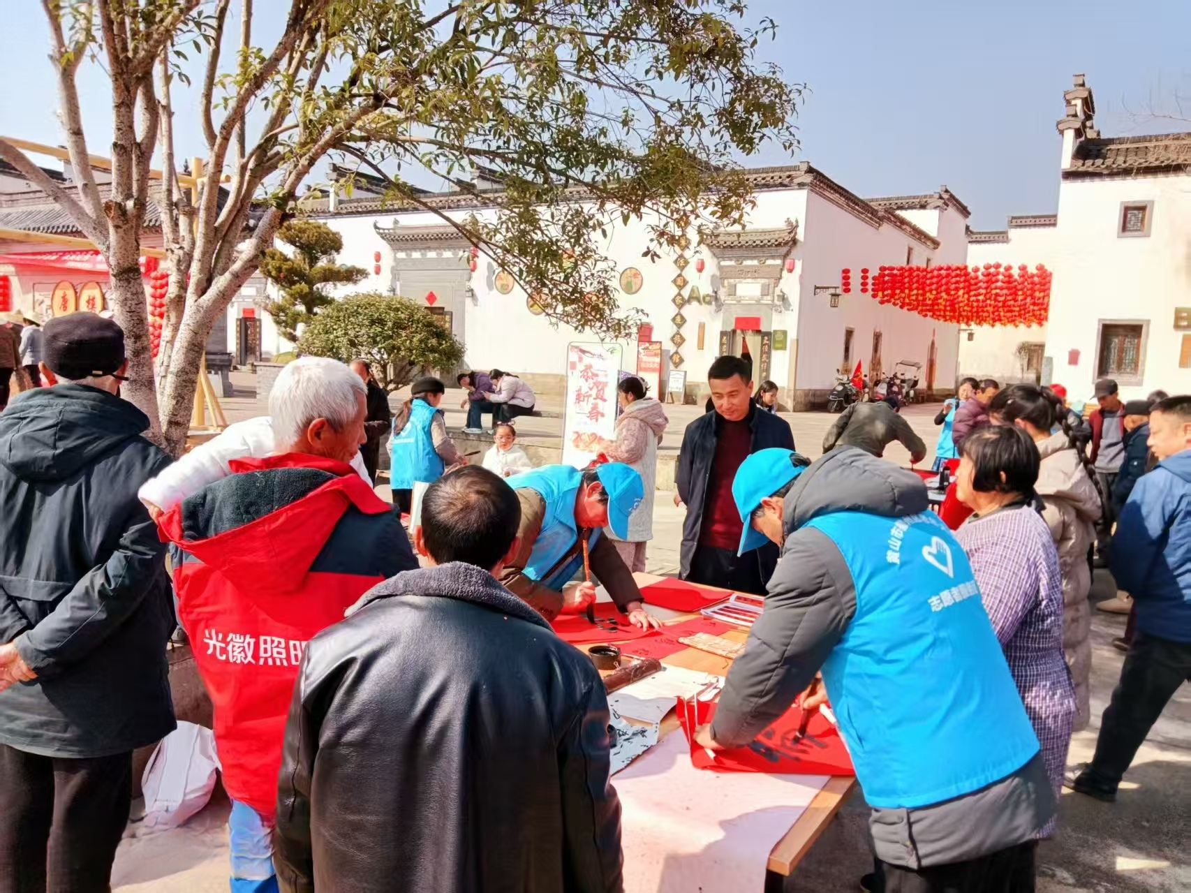 随后,春联送福环节温情开启。村书法爱好者、老年大学书法班学员现场挥毫泼墨,书写“唐模古韵 乡村新颜”等春联与福字,内容涵盖通用吉祥、农耕丰收、唐模特色三大类,还可现场定制专属祝福语。村民们有序排队领取,脸上洋溢着幸福笑容,纷纷表示“手写春联更有年味,把福气带回家”。