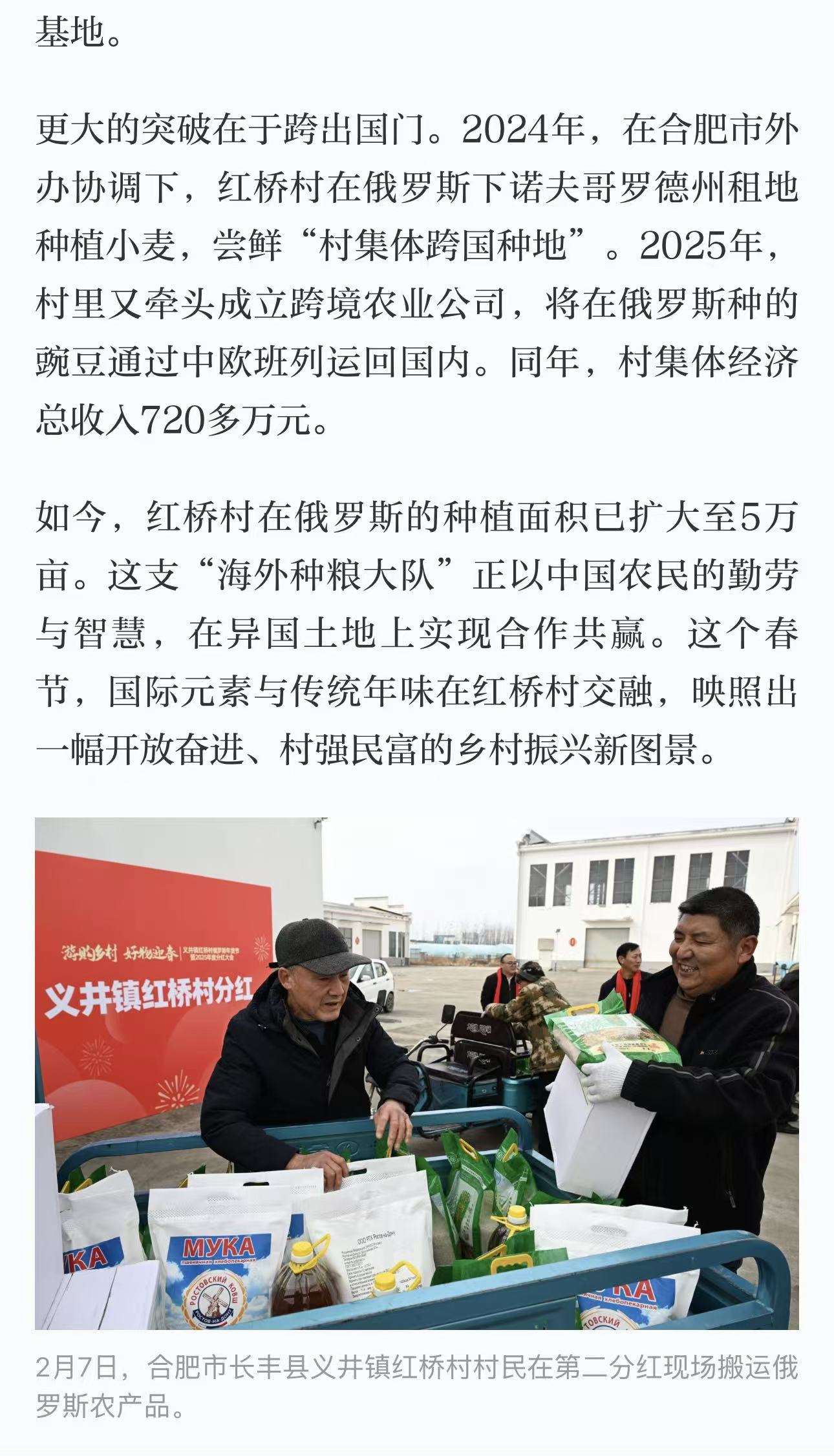 在省文旅投控集团等单位的持续支持下,红桥村积极拓展产业发展边界,主动“走出去”布局海外产业,在俄罗斯成功拓展种植面积至5万亩,实现了产业发展的跨国突破。2026年,红桥村820户村民不仅如期领到股权红利,更收获了来自俄罗斯的“国际年货”,切实共享产业发展成果。