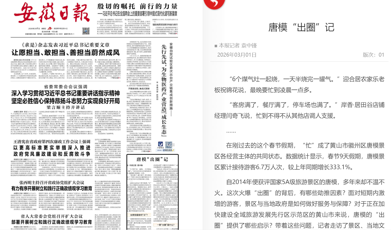 3月1日,《安徽日报》聚焦春节期间唐模文旅活动,头版刊登报道《唐模"出圈”记》。2026年春节假期,集团所属唐模景区依托“满池娇・独占鳌头”主题文旅活动实现“现象级”爆红,游客接待量和营业收入双双创下历史新高。春节假期合计接待游客 6.7万人次,增长 333.1% 。截至目前,日均接待游客约 5000 人次,持续释放新春消费活力, 助力展现“皖美如画”文旅新形象。